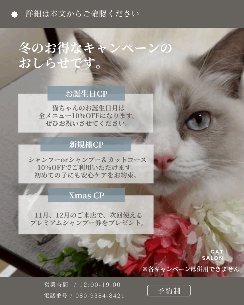 猫専門トリミングサロンでお得なキャンペーンはじめました。